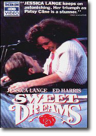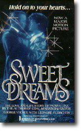 And, of course, the movie about Patsy's life, "Sweet Dreams", released in 1985 and starring Jessica Lange as Patsy and Ed Harris as Charlie. The movie was re-released on video in late December, 1998. When the movie was first released, in 1985, there was also a book released, with the same name, in conjunction with the movie. Author's credit is given to George Vecsey and Leonore Fleisher, but it is really nothing more than an enhanced version of the movie's script, which was written by Robert Getchell.